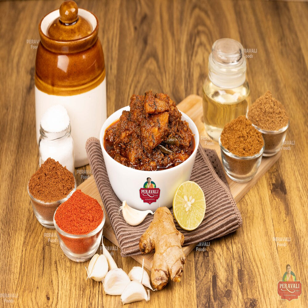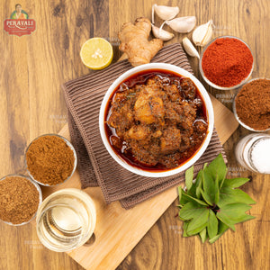 This isn’t just a pickle—it’s Andhra pride in a spoonful. We take fresh gongura leaves, known for their bold sourness, and slow-cook them with succulent boneless chicken in cold-pressed sesame oil. The result is a richly spiced, tangy pickle that hits all the right notes: earthy, hot, and lip-smackingly bold.