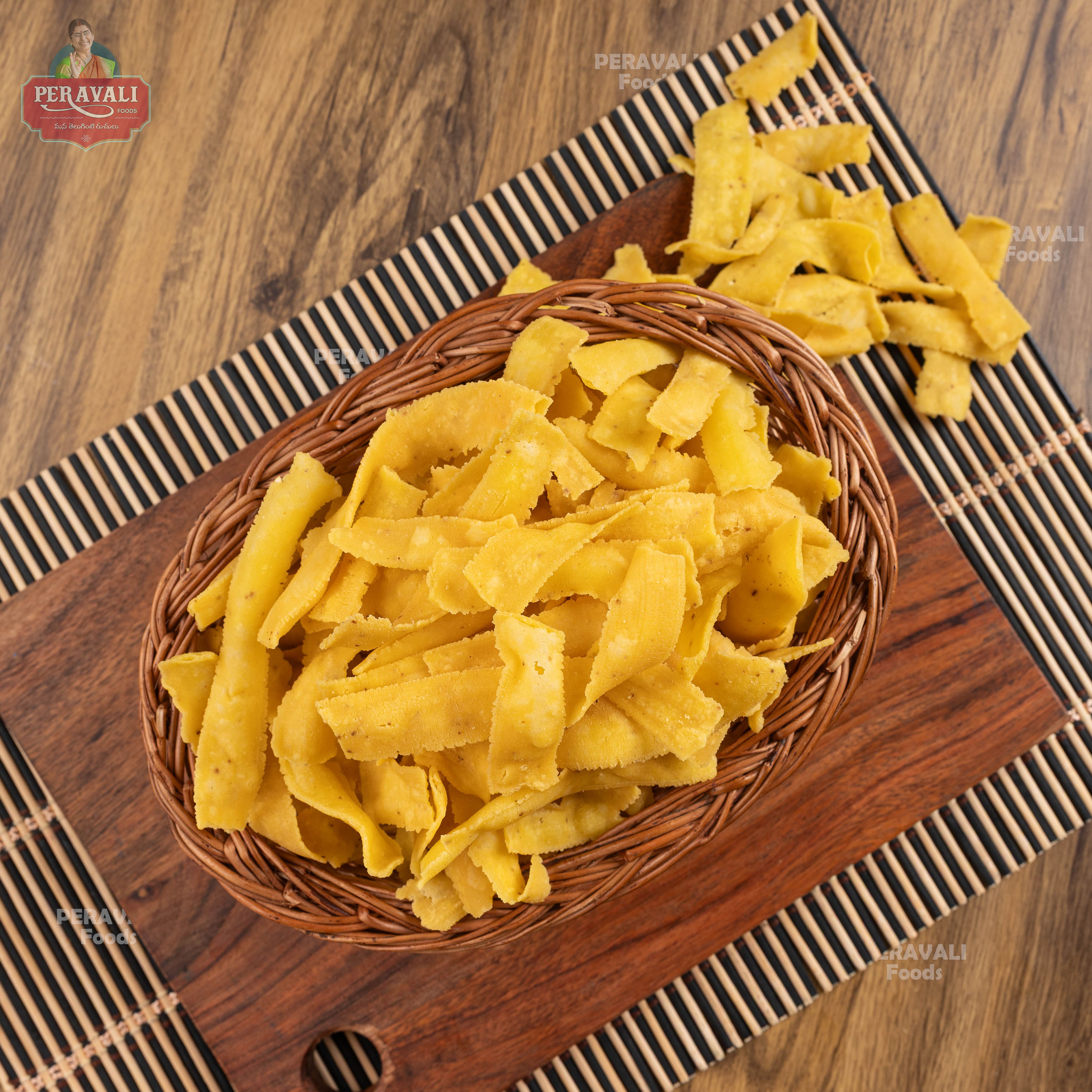 There’s a joy in watching Ribbon Pakodi swirl into hot oil wide golden ribbons dancing in the kadai, filling the air with spice and anticipation. At Peravali, we make them the way our mothers and peddammalu did crisp, bold, and full of Andhra soul. Each batch is handcrafted to give you the same crunch we grew up sneaking from steel dabbas after school.